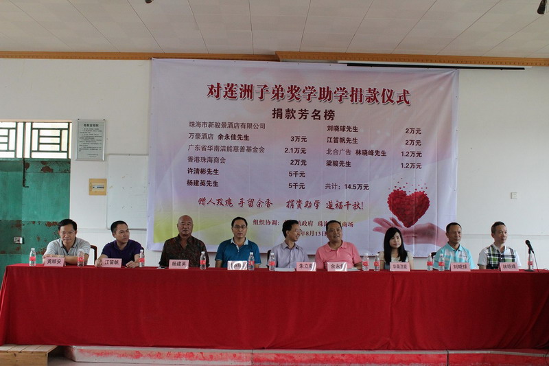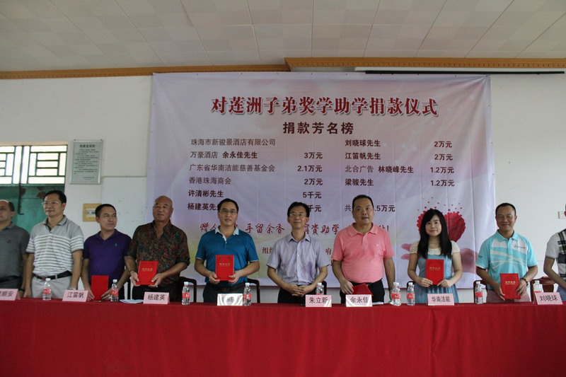 斗門區委常委朱立新先生、斗門區蓮洲鎮委書記黃順安先生、蓮洲鎮鎮長梁夢純女士等相關部門領導出席本次捐助儀式。斗門區委常委朱立新先生發表講話,他對社會各界愛心企業及人士無私奉獻表示感謝,對現場受助學生寄予美好期望,希望他們學會感恩,鼓勵他們熱愛生活,追求幸福。儀式中,愛心企業及個人對49名受助貧困學生給予每人3000元人民幣助學金。受助學生深表感激,希望以更好的成績回報社會。同時,朱立新先生、黃順安先生、梁夢純女士為愛心企業及人士頒發榮譽證書,鼓勵善舉。香港珠海商會理事周國祥先生作為代表接受了榮譽證書。鏈接: