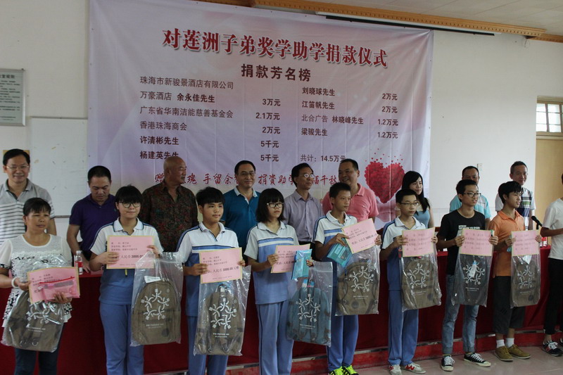 2015年8月13日,由珠海市斗門區蓮洲鎮政府、珠海免稅商場組織的“對蓮洲子弟獎學助學捐助儀式”在珠海市斗門區蓮洲鎮橫山中學科技館舉行。香港珠海商會和一眾愛心企業及人士共捐助善款14.7万元人民幣及學習用品一批,用於資助來自橫山中學、蓮溪學校的49名成績優秀的貧困學生。捐助活動發起人香港珠海商會名譽會長楊建英先生,聯同副會長余永佳先生、理事周國祥先生及梁曉彤女士參加了捐助儀式。