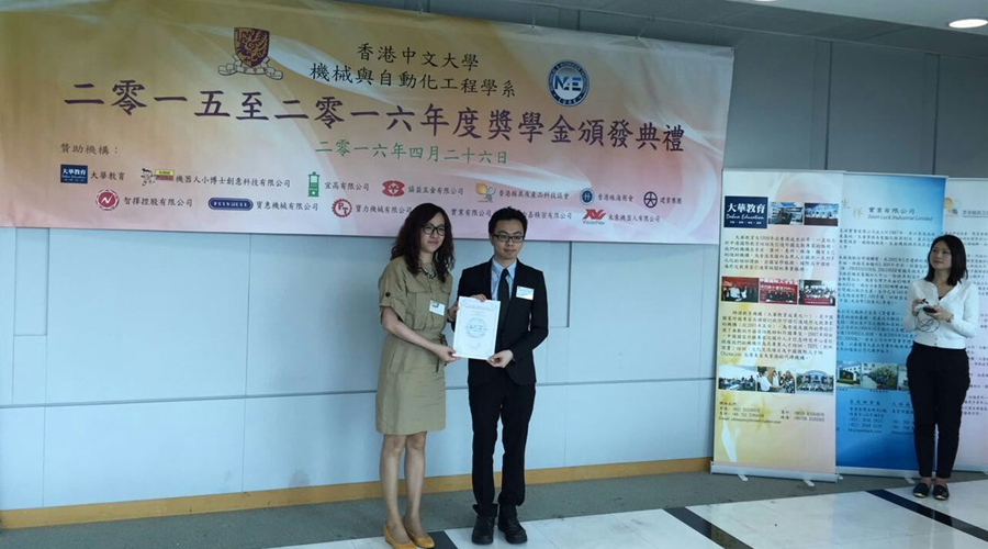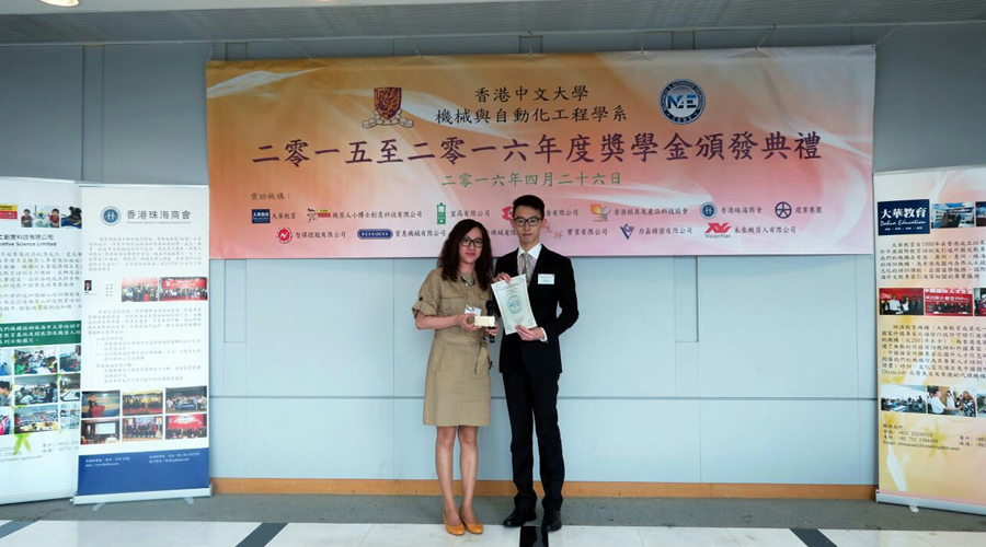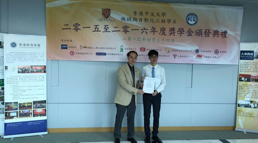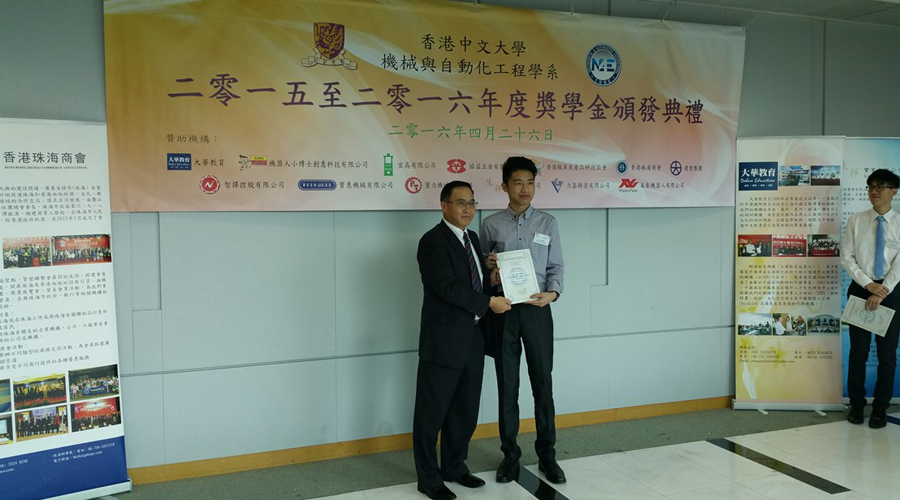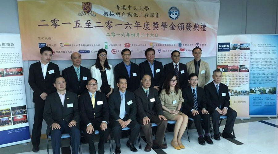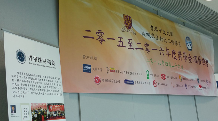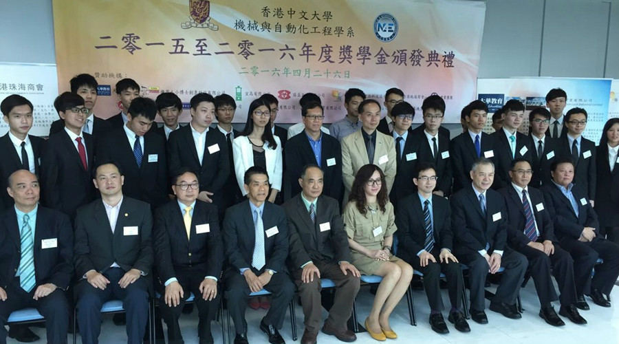 2016年4月26日,香港珠海商會參加了香港中文大學機械與自動化工程學系2015-2016年度獎學金頒發典禮。透過商會執委理事、香港中文大學機械與自動化工程學系校企拓展主任唐珩博士的引薦,商會對香港中文大學機械與自動化工程學系共贊助了兩位學生的獎學金。活動當中商會執委理事周國祥和副秘書長歐陽子安向得獎學生頒發獎學金獎狀,並由執委理事周國祥代表商會接受校方工程學院副院長廖維新教授致送紀念牌。