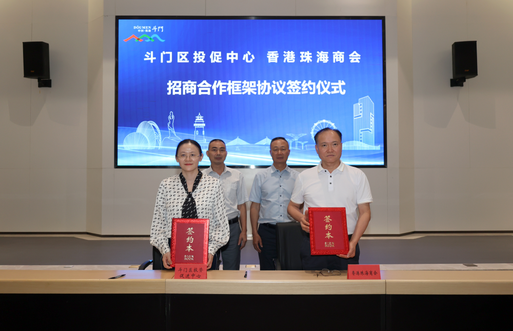 斗门区投资促进中心副主任李扬帆与香港珠海商会执行会长卢迅民进行签约仪式;区政协副主席赖戊亮与商会会长陈剑英作见证