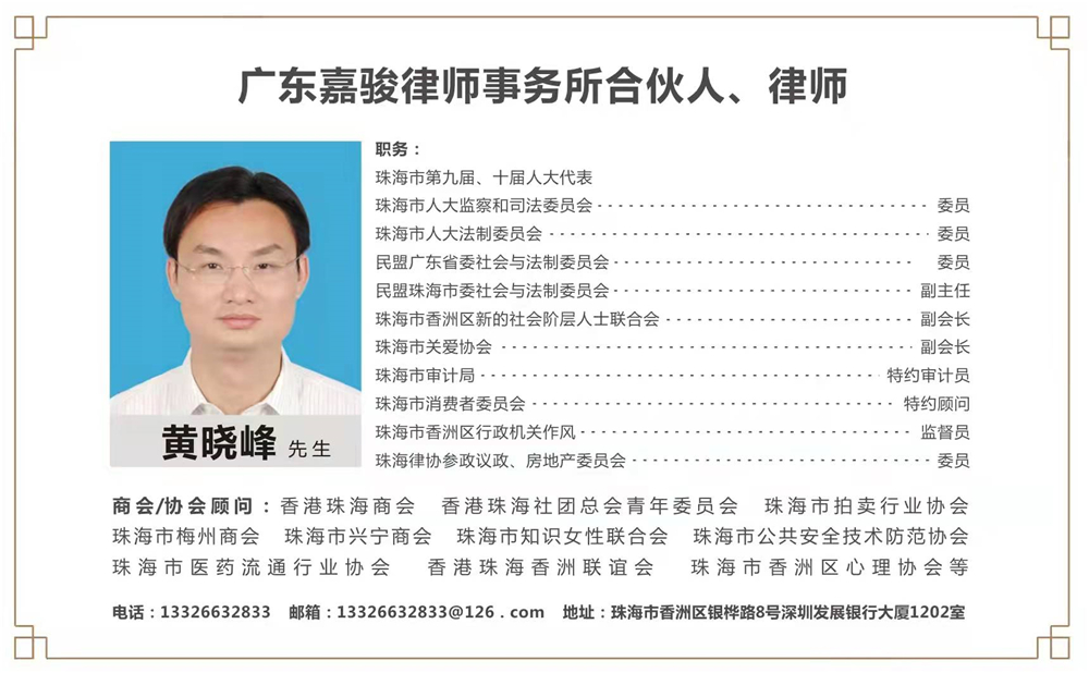 广东嘉骏律师事务所是一家主要由中青年律师组成的综合性、合伙制律师事务所。全所律师及工作人员共46名,其中执业律师28人、特邀(法律界和政界精英)顾问8名、律师助理及行政人员10人;硕士以上学历人员11名,其余人员均具有本科以上学历。人均办公面积约33平方米。深厚的法律功底、丰富的办案经验、庞大的顾问团队、良好的社会关系、科学的管理体系、严谨的操作流程、个性化的解决方案,为当事人(客户)提供最优、最专业、最快捷、全方位的法律服务。以其海纳百川的宽广胸襟,汲取法律文化与律师执业理念之精华,始终以“嘉言善行、骏德致远,厚德明法、公平正义”为核心文化,以“执业为民、诚实信用、勤勉敬业、优质高效”为执业宗旨。同时,又以服务国家和人民、推动依法治国为己任,不断提高团队业务素质与合作精神,拓展业务领域,积累社会资源,完善管理模式,增进对外沟通与交流,获得了当事人(客户)的信任与好评,不断向一流律师事务所的目标迈进。